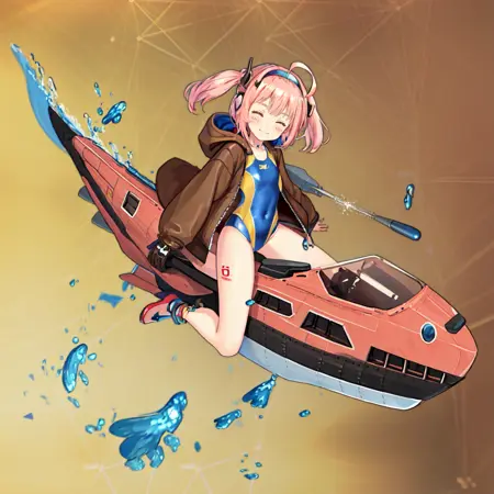 lora:AZUR\_LINE-000008:0.8, KMS, SS, AZUR LINE, 1girl, torpedo, one-piece swimsuit, ahoge, closed eyes, pink hair, solo, swimsuit, rudder footwear, iron cross, jacket, riding, bubble, air bubble, hood, gloves, smile, hairband, yellow gloves, body writing, water, small breasts, hooded jacket, tattoo, cross, watercraft, anklet, hood down, underwater, full body, blush, blue one-piece swimsuit, closed mouth, headgear, double vertical stripe, competition swimsuit, two side up, long sleeves, hair ornament, white hairband, breasts, character name, ^_^, open jacket, open clothes, water drop, uneven sleeves, v-shaped eyebrows, jewelry, submerged, arched back, asymmetrical sleeves, thighs, red footwear, machinery, splashing, leg tattoo, sidelocks, clothes writing, brown jacket, black one-piece swimsuit, high heels, covered navel, brown background, yellow background, short hair, straddling