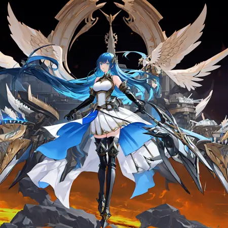 lora:AZUR\_LINE-000008:0.8, FFS, BB, AZUR LINE, 1girl, blue hair, breasts, long hair, dress, white dress, holding, very long hair, looking at viewer, large breasts, blue eyes, scythe, thighhighs, wings, sky, solo, boots, cloud, see-through, holding scythe, blue sky, full body, underboob, day, robot, armored boots, non-humanoid robot, rigging, weapon, gloves, water, black footwear, arm up, absurdly long hair, see-through dress, holding weapon, robot animal, blue ribbon, outdoors, halo