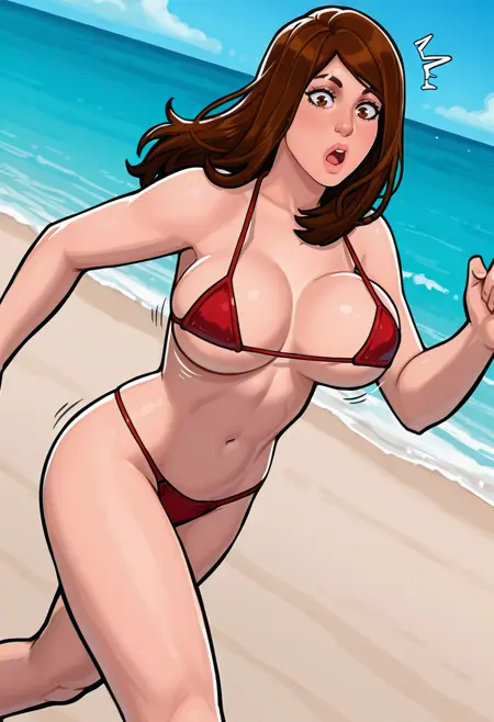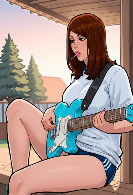 提示词:liz trw, 1girl, brown hair, brown eyes, long hair, lips, white shirt, plaid shirt, denim, torn pants, black bracelet