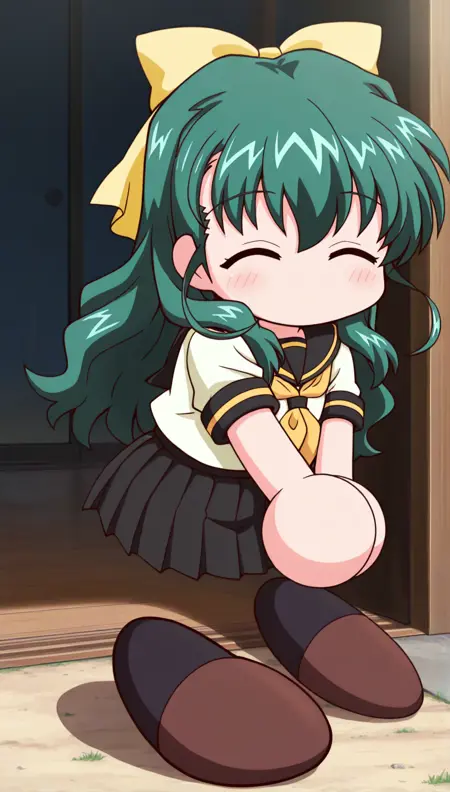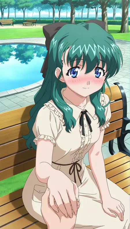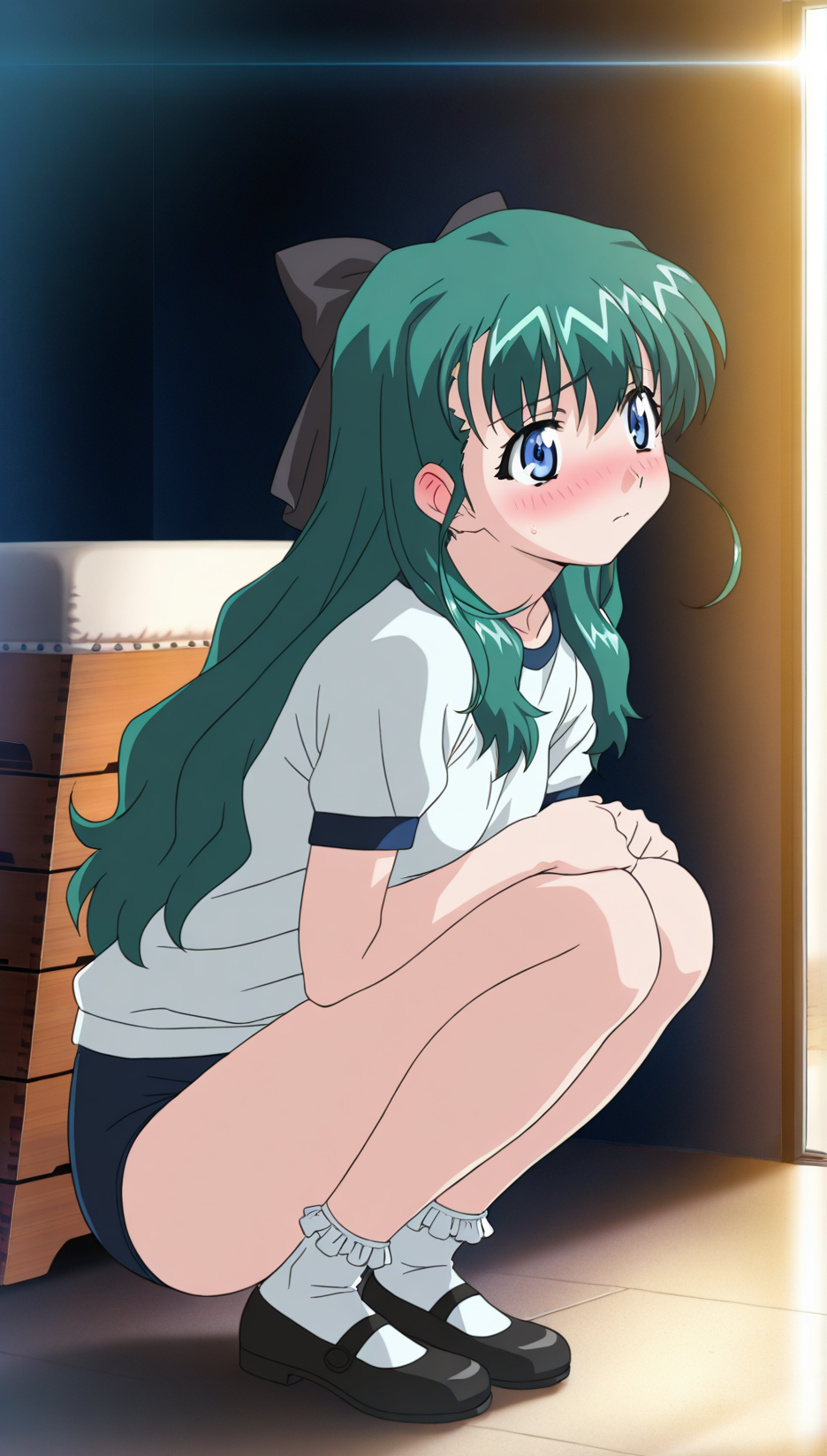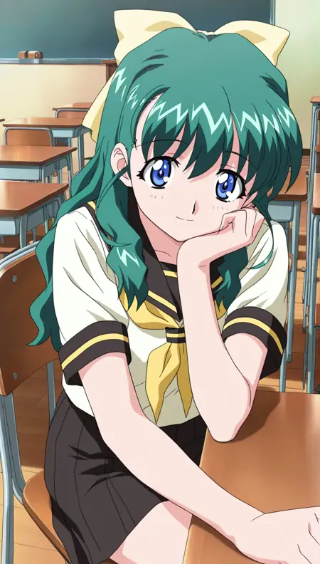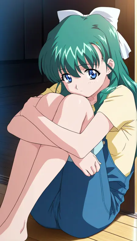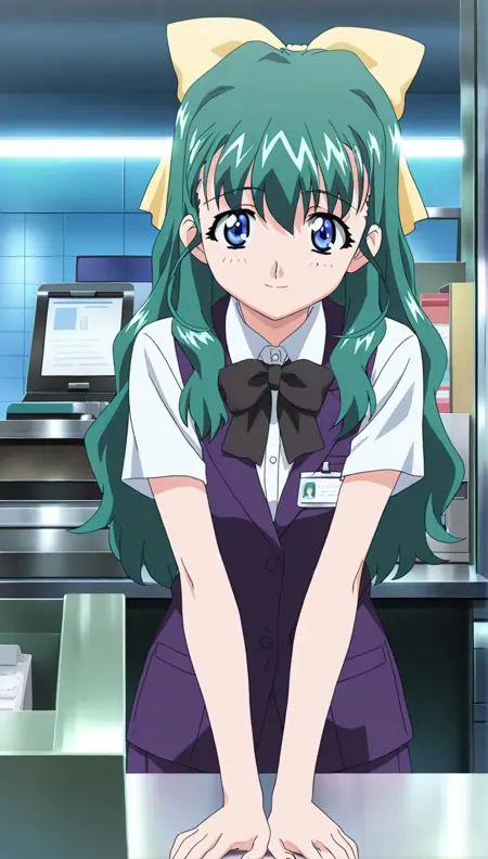 tvkaren,1girl, long hair,green hair, blue eyes, 1990s \(style\), hair bow,