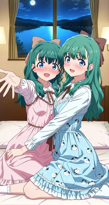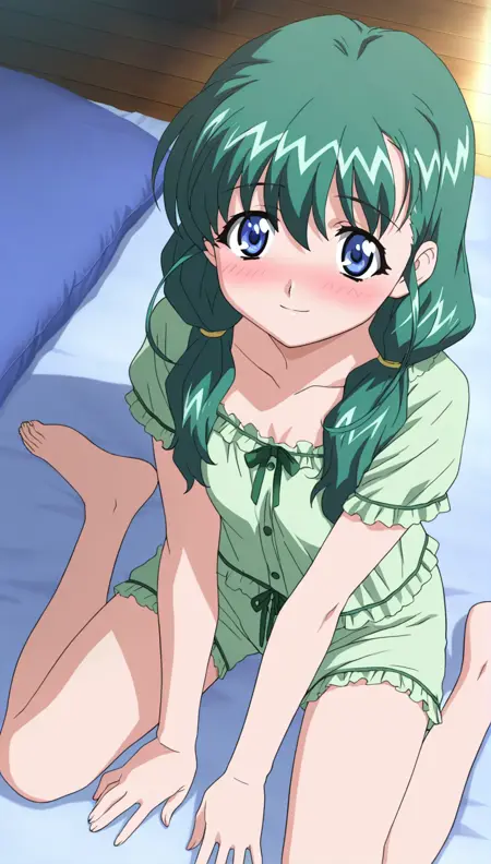 pajamas,short sleeves, frills pajamas,green pajamas, low twintails, shorts,