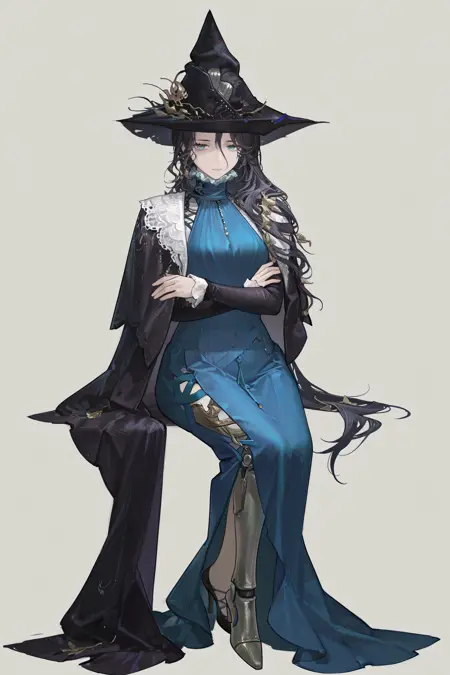 witch hat, hat ornament, black headwear, black hair, wavy hair, hair between eyes, very long hair, hair ornament, blue eyes,
