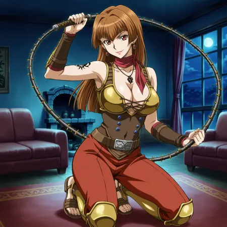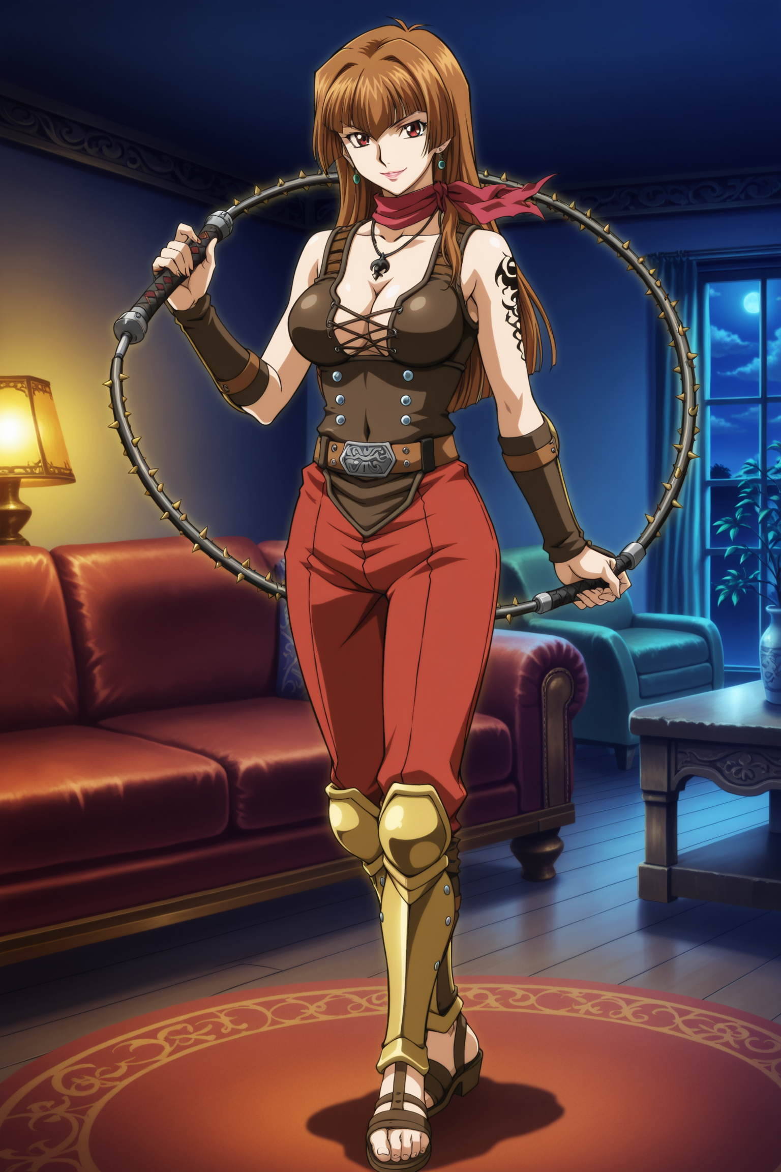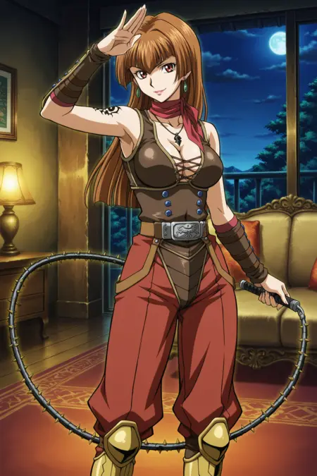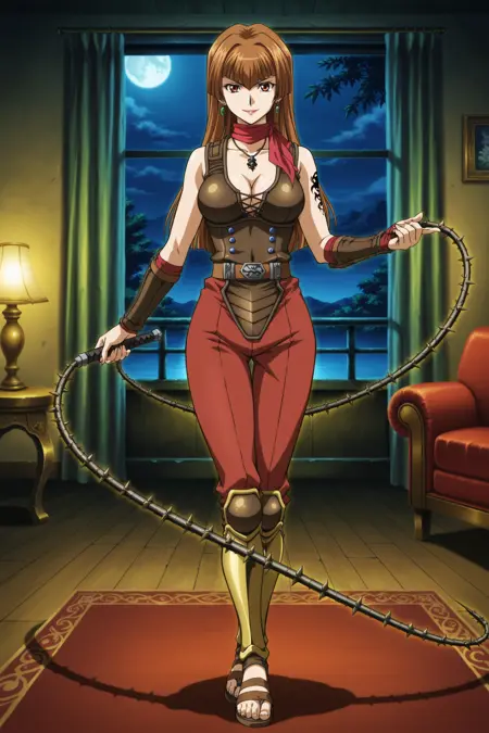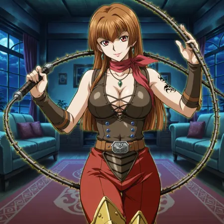 yugioh_card_style, yugioh_card_for_dark_scorpion_meanae_the_thorn, 棕色头发, 长发, 嘴唇, 耳环, 项链, 大胸, 锁骨, 覆盖肚脐, 乳沟, 微笑, 红色长裤, 过膝护腿, 金色装甲护腿, 棕色系带护腿, 红色围巾, 交叉系带, 装饰性蓝色纽扣, 无指臂套, 棕色臂甲, 战术束腰带, 装甲腰带, 手臂上的黑色蝎子纹身, 露趾凉鞋, 带刺鞭子