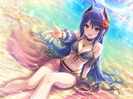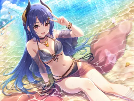 official style, more details, lora:Rei5464:0.9, 1girl, horns, swimsuit, bikini, jewelry, outdoors, hair ornament, sitting, blue hair, ocean, sarong, beach, red eyes, bracelet, necklace, very long hair, choker, black bikini, wet, arm support, front-tie top, paw_pose, shy, blush,