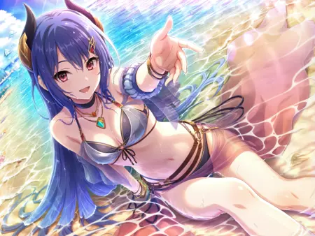 official style,more details,lora:Rei5464:0.9,1girl,horns,swimsuit,bikini,jewelry,outdoors,hair ornament,sitting,blue hair,ocean,sarong,beach,red eyes,bracelet,necklace,very long hair,choker,black bikini,wet,arm support,front-tie top,paw_pose,shy,blush,