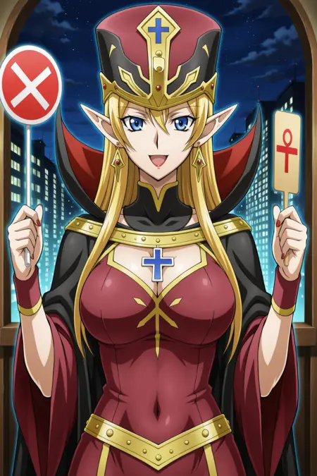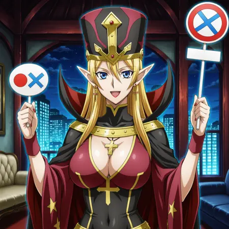 yugioh_card_style, yugioh_card_for_ms_judge, 金发, 长发, 尖耳朵, 红唇, 红指甲, 耳环, 银色十字项链, 大胸, 锁骨, 遮住肚脐, 乳沟, :d, 礼服, 金色镶边斗篷, 高领披风, 品红与黑色配色, 箭头图案, 华丽帽子, 箭头头盔, 蓝眼睛, 尖锐精灵耳, 手持判决板, 右手持红色圆圈标志, 左手持蓝色十字标志, 客厅, 夜晚, 建筑, 直视观众