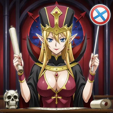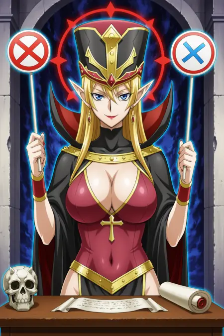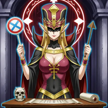 yugioh_card_style, yugioh_card_for_ms_judge, 金发, 长发, 尖耳朵, 红唇, 红指甲, 耳环, 项链, 大胸, 锁骨, 遮住肚脐, 乳沟, 微笑, 礼服, 金色镶边斗篷, 高领披风, 品红与黑色配色, 箭头图案, 华丽帽子, 箭头头盔, 蓝眼睛, 尖锐精灵耳, 手持判决板, 右手持红色圆圈标志, 左手持蓝色十字标志, 木制桌面, 骷髅装饰, 桌上卷轴, 法庭, 直视观众
