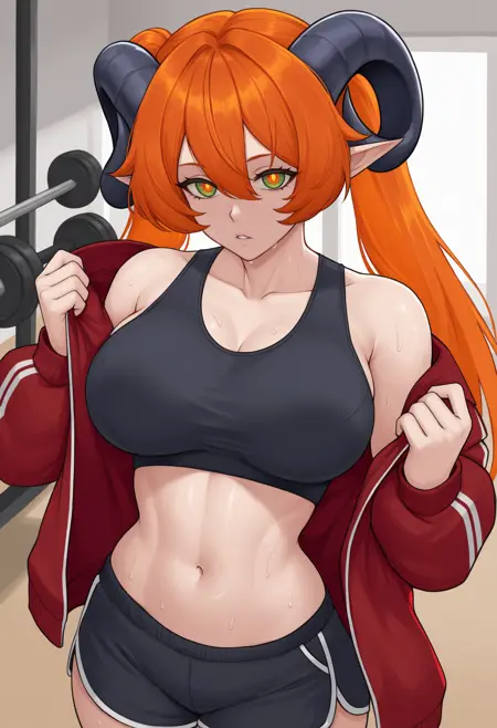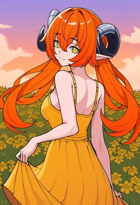 Appearance: long hair, orange hair, hair between eyes, twintails, dragon horns, curled horns, pointy ears, green eyes, orange pupils, large breasts