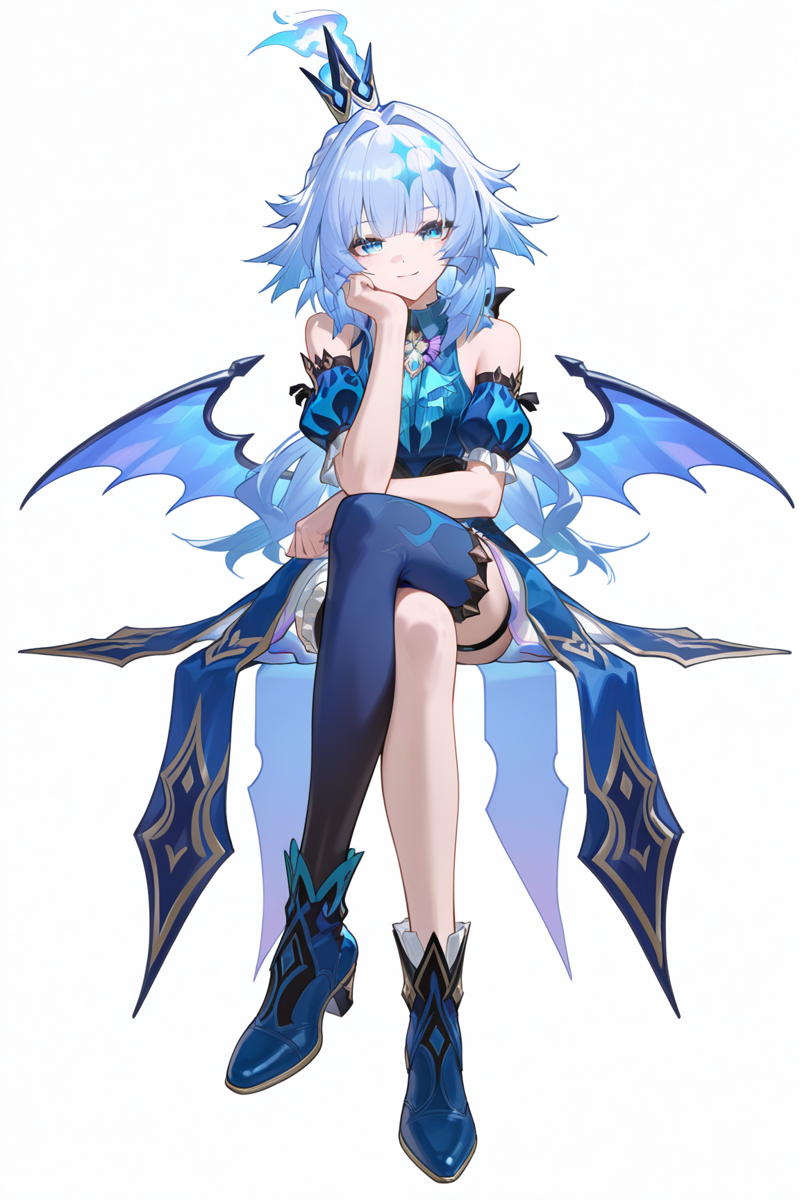 cerydra \(honkai star rail\), 1girl, solo, crown, blue hair, blue eyes, hair print, wings, white hair, long hair, dress, detached sleeves, braid, bare shoulders, mini crown, bowtie, shirt