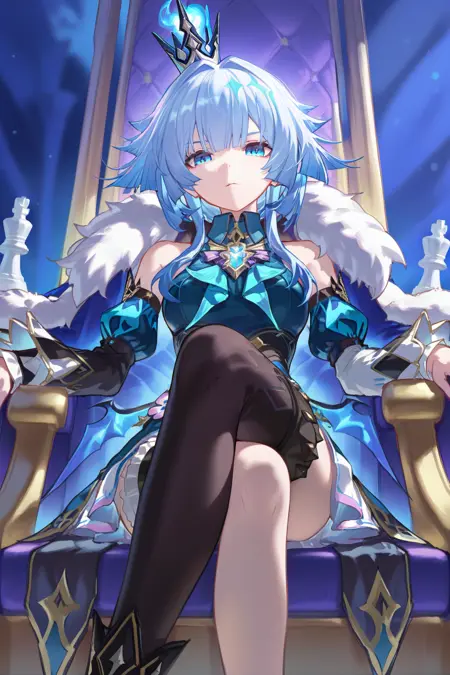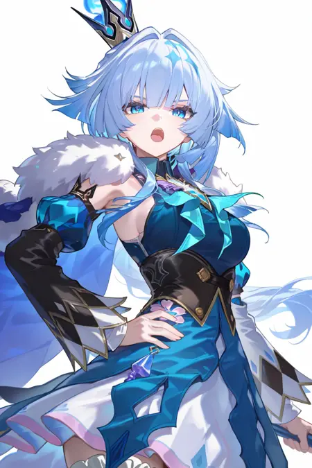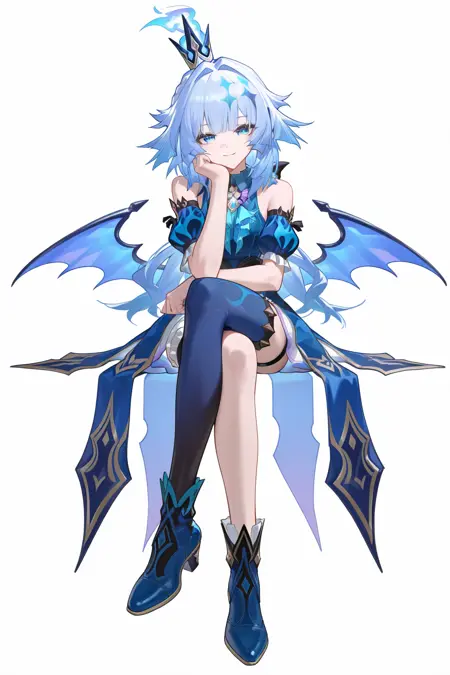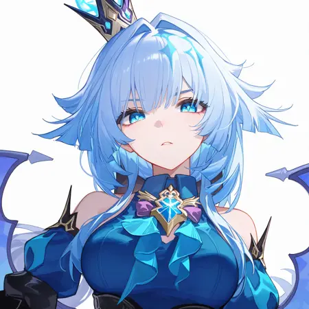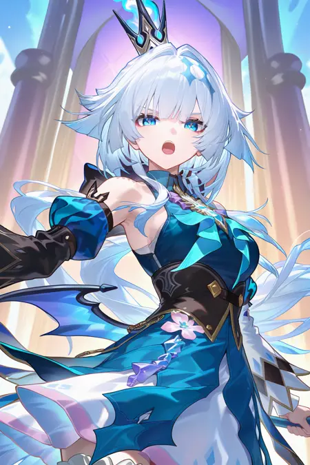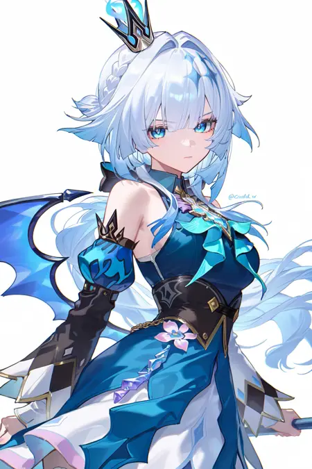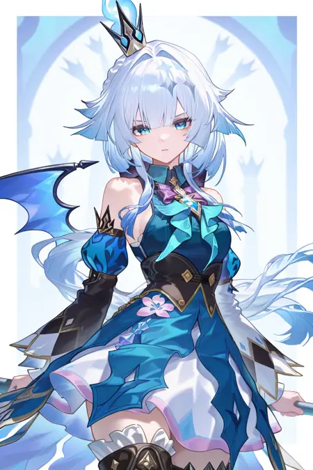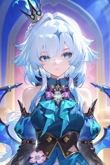 cerydra \(honkai star rail\), 1girl, solo, crown, blue hair, blue eyes, hair print, wings, white hair, long hair, dress, detached sleeves, braid, bare shoulders, mini crown, bowtie, shirt