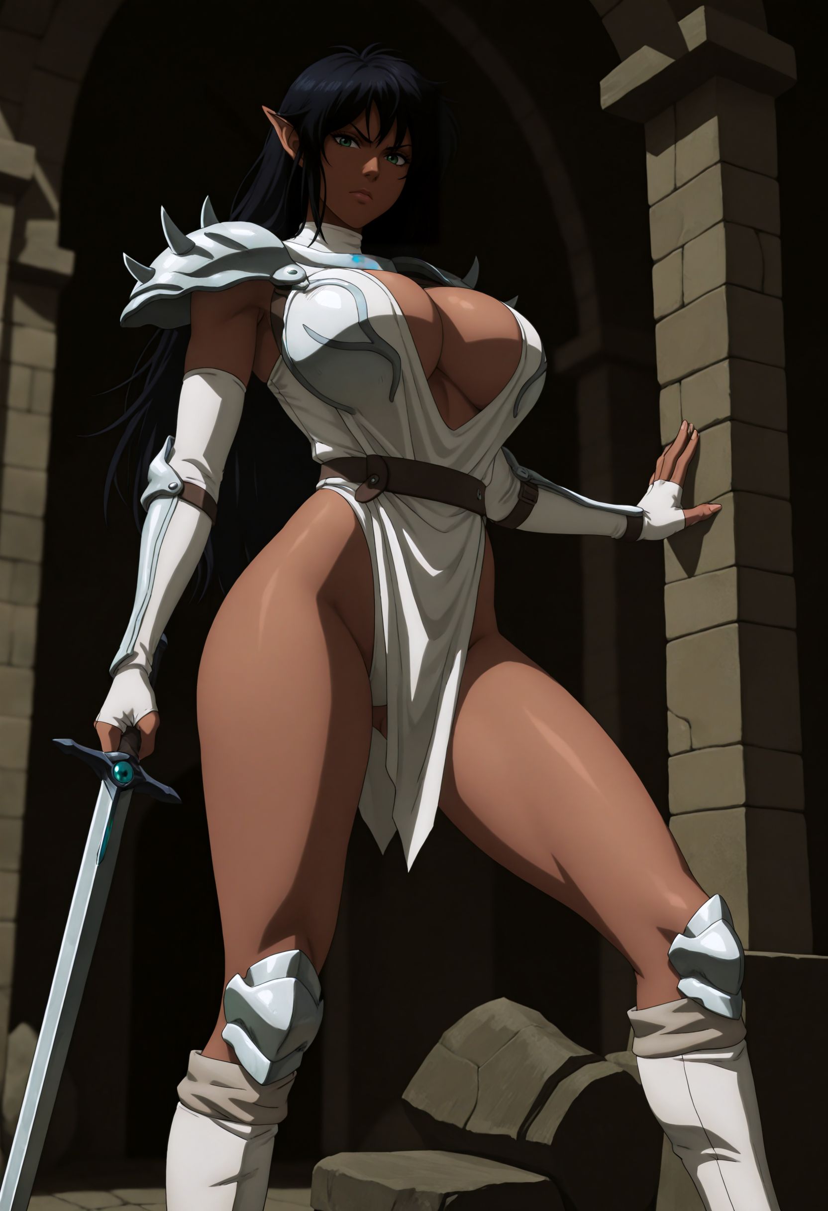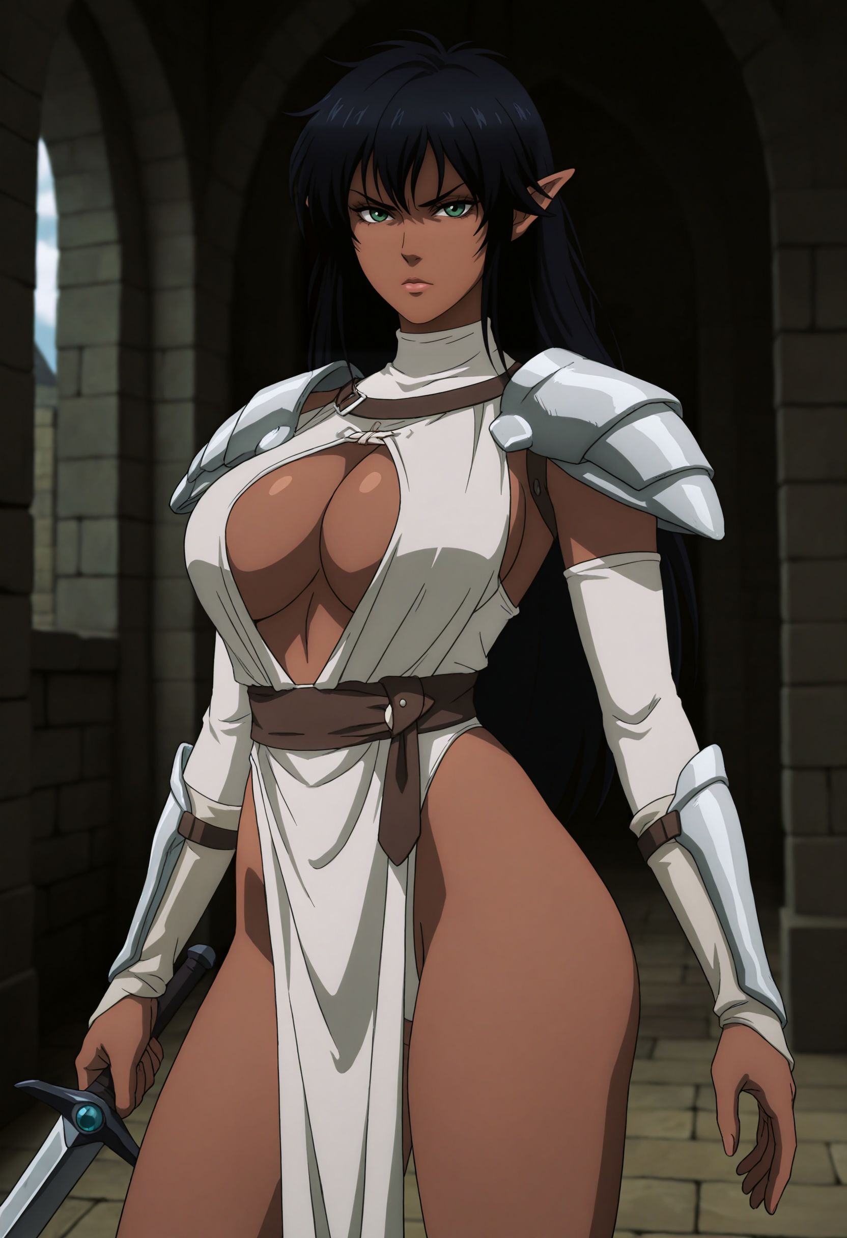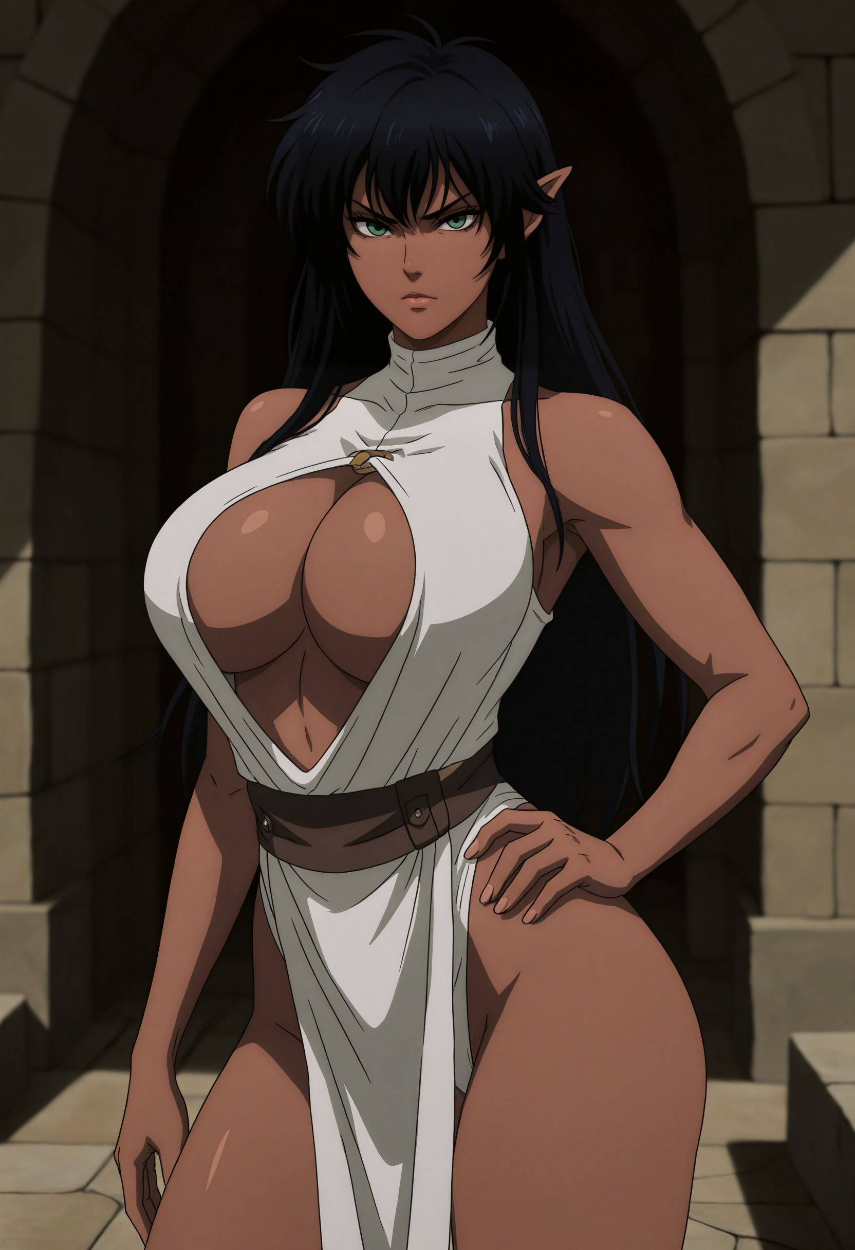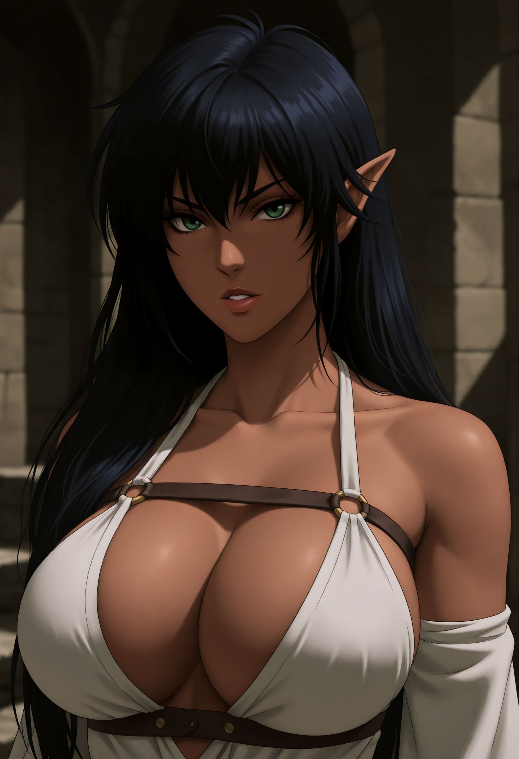 キーワード: arshesneibstr、黒髪、緑の目、長髪、肌の黒い女性、エルフ、巨乳、