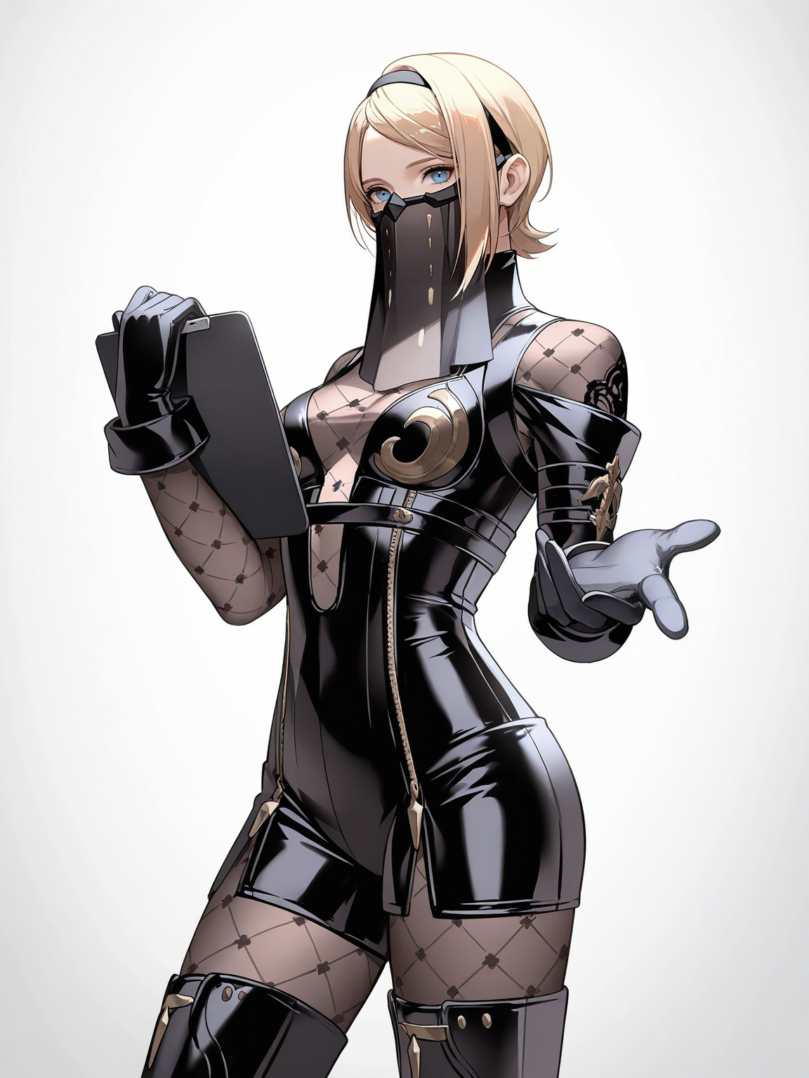 hairband, mouth veil, bodysuit, fishnets, zipper, black gloves, thigh boots