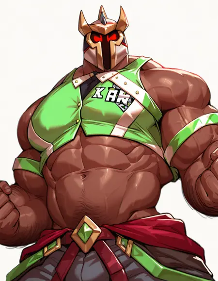 helmet, strap, red_strap, long_strap, gold_ring, rhombus_shape, from_behind, dark skin, glowing eyes, green armband, purple bowtie, red eyes, white_shoes_with_green_lining , green vest, cropped vest, white body harness, belts, rivets, criss-cross, green-cuffed_white_gloves