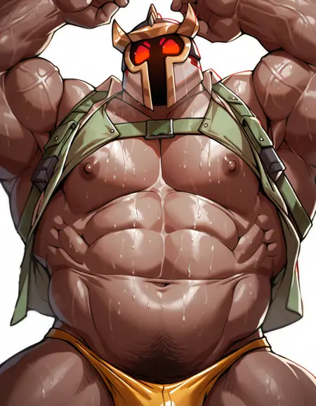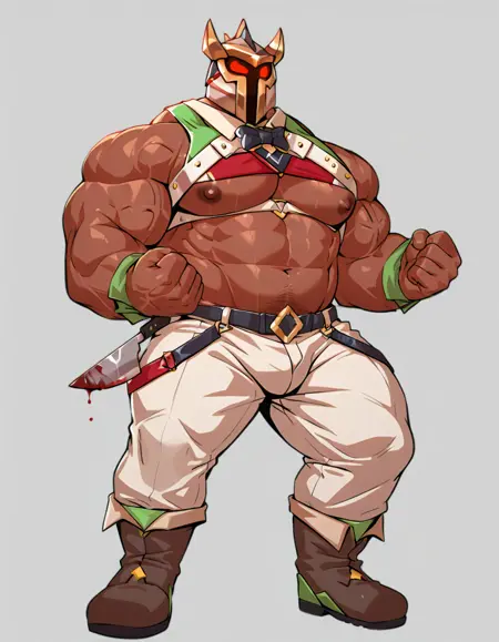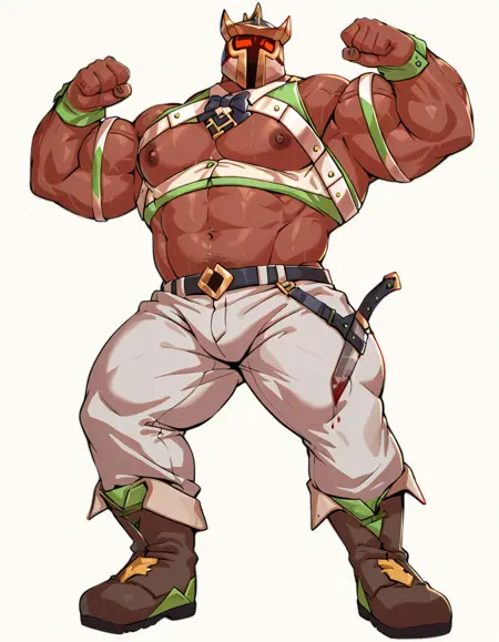헬멧, 스트랩, 레드_스트랩, 롱_스트랩, 골드_링, 마름모_형태, 뒤에서_보기, 검은 피부, 빛나는 눈, 녹색 팔찌, 보라색 넥타이, 빨간 눈, 녹색 안감이 있는 흰 신발, 녹색 조끼, 짧은 조끼, 흰색 바디 하네스, 벨트, 리벳, 십자형, 녹색 끝장이 있는 흰 장갑
