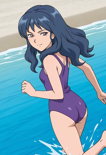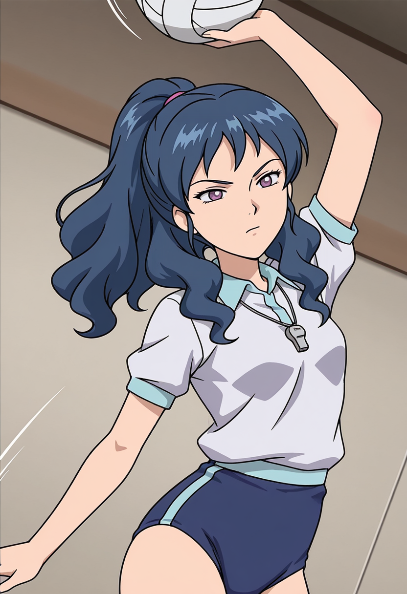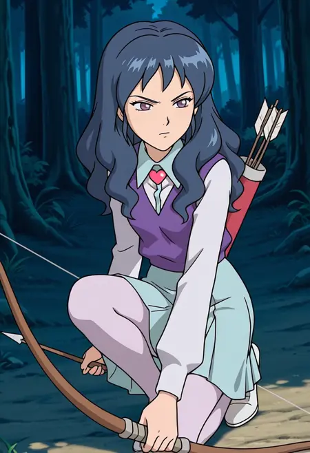 提示词: menori_visconti, 1girl, 长发, 波浪发, 蓝发, 紫眼, 校服, 背心, 毛线背心, 心形胸针, 裙子, 浅紫色连裤袜, 鞋子