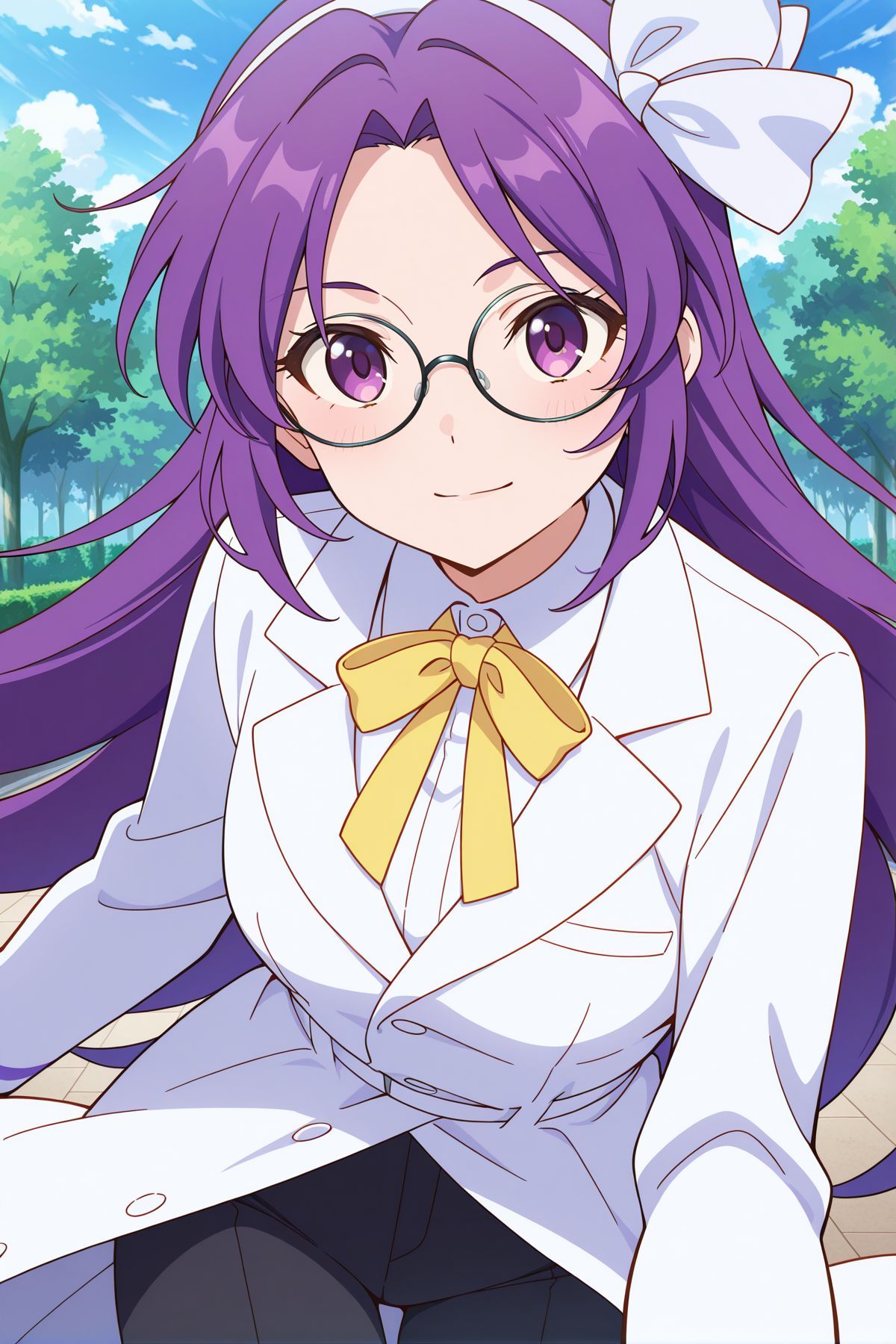 asakura rikako, 1girl, solo, purple eyes, purple hair, long hair, glasses, round eyewear, black-framed eyewear,