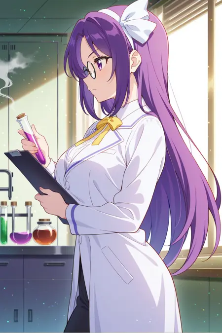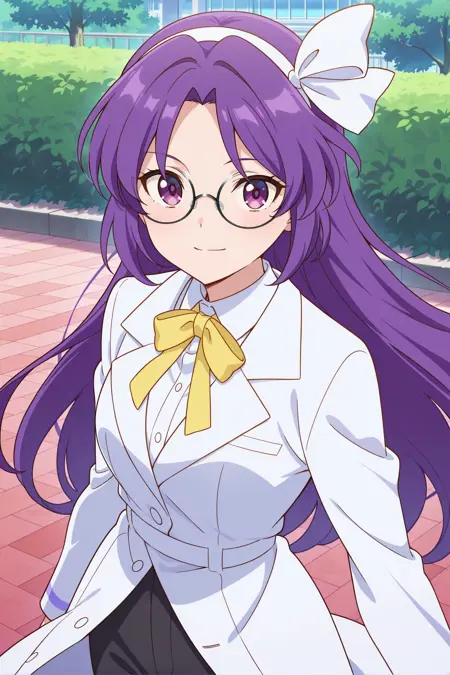 white hairband, hair ribbon, white ribbon, yellow neck ribbon, white coat, lab coat, long coat, long sleeves, white shirt, collared shirt, buttons, black pants,