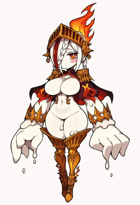 candlegeistmge, 흰색 바디수트, 왁스 바디수트, 붉은 불, 머리카락 불꽃, 떨어지는 왁스, 흰 피부, 색상이 있는 피부, 과도하게 큰 사지, 과도하게 큰 손, 손가락 수 감소