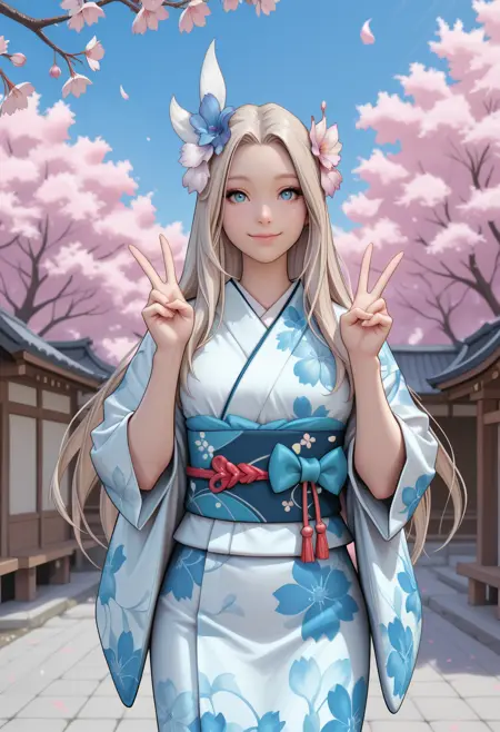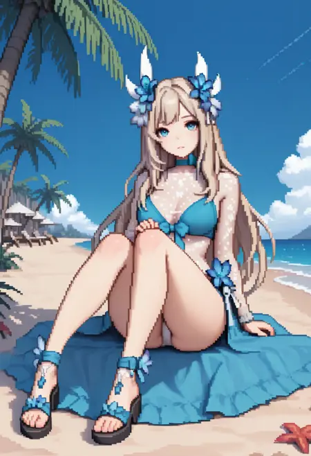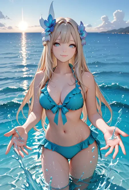 LANeria, 1girl, hair ornament, blonde hair, long hair, hair flower, blue eyes