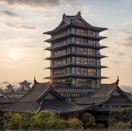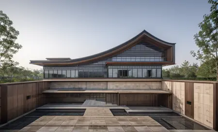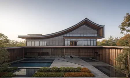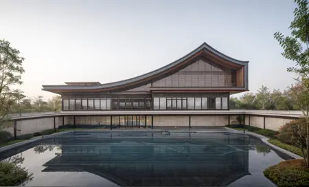 긍정적인 프롬프트 단어: 떨어진 잎, 죽은 나무, 가을 스타일, 벽 나무 질감, 새로운 중국 건축, 고품질, 건축 사진, 8K, 수영장,