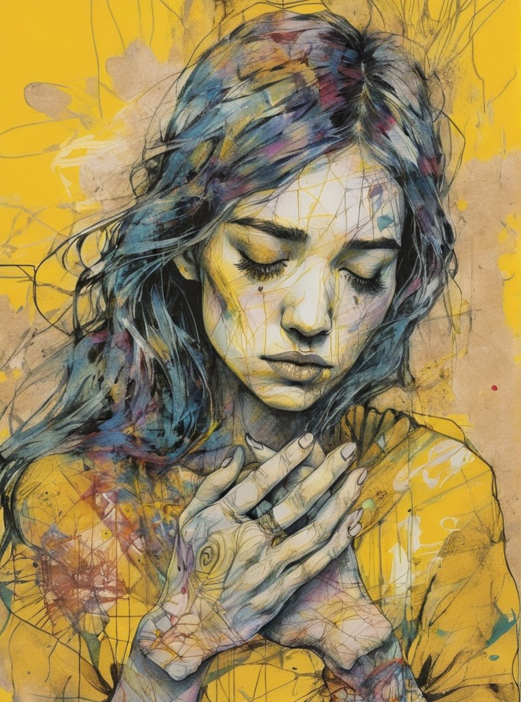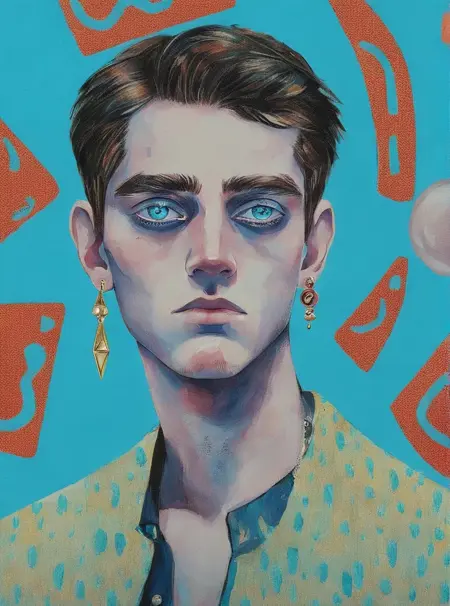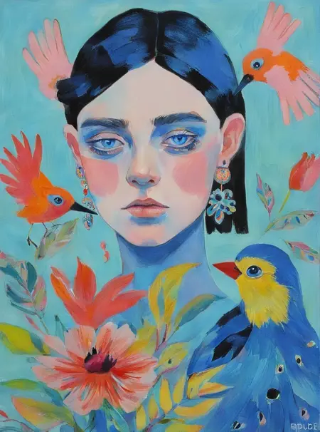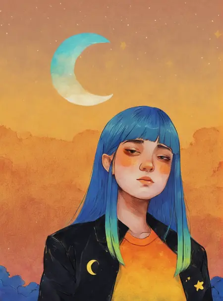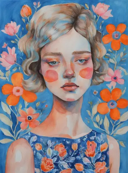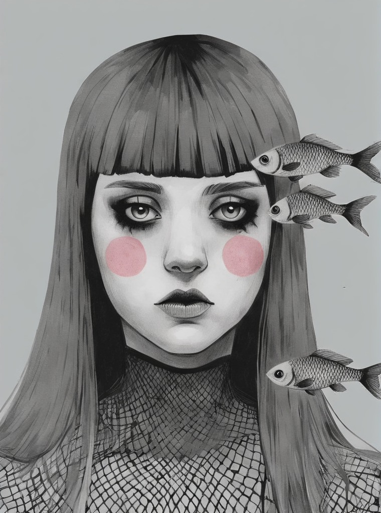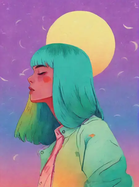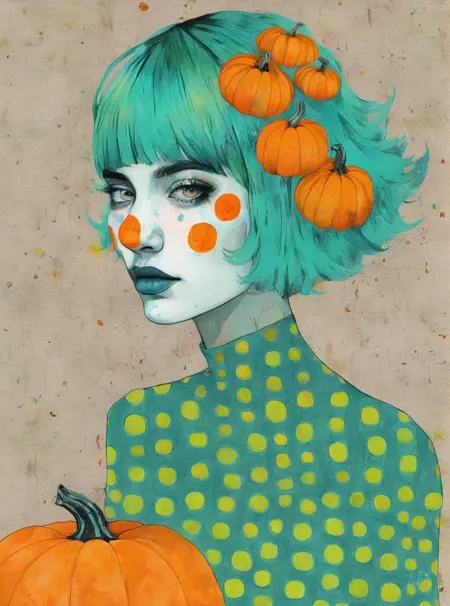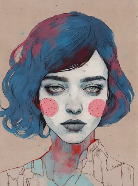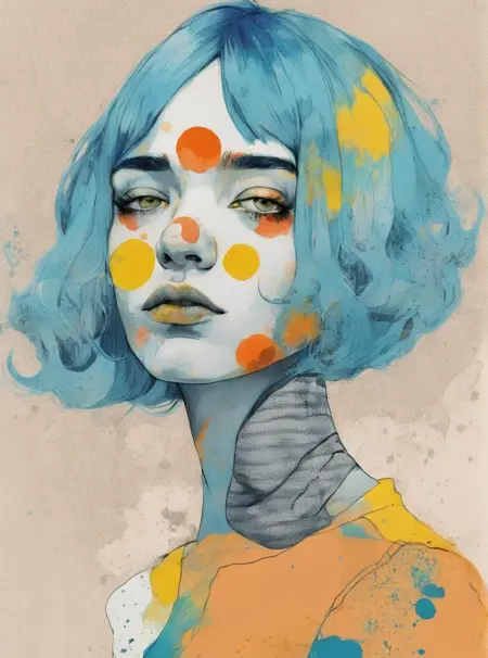 やや乱れたデッサン、スケッチのような線、そして非常に興味深い色の使い方が組み合わさったスタイルです。このスタイルはポップアートにインスパイアされており、鮮やかなパターンと丸い頬が特徴です。