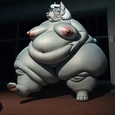chubby, elderly, female, dog, black top, black skirt, white hair, glasses,