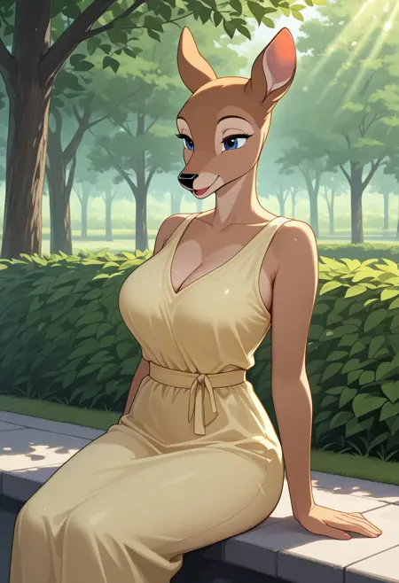 Faline, 1girl, mature female, dark blue eyes, animal ears, anthro, doe, brown fur