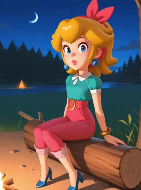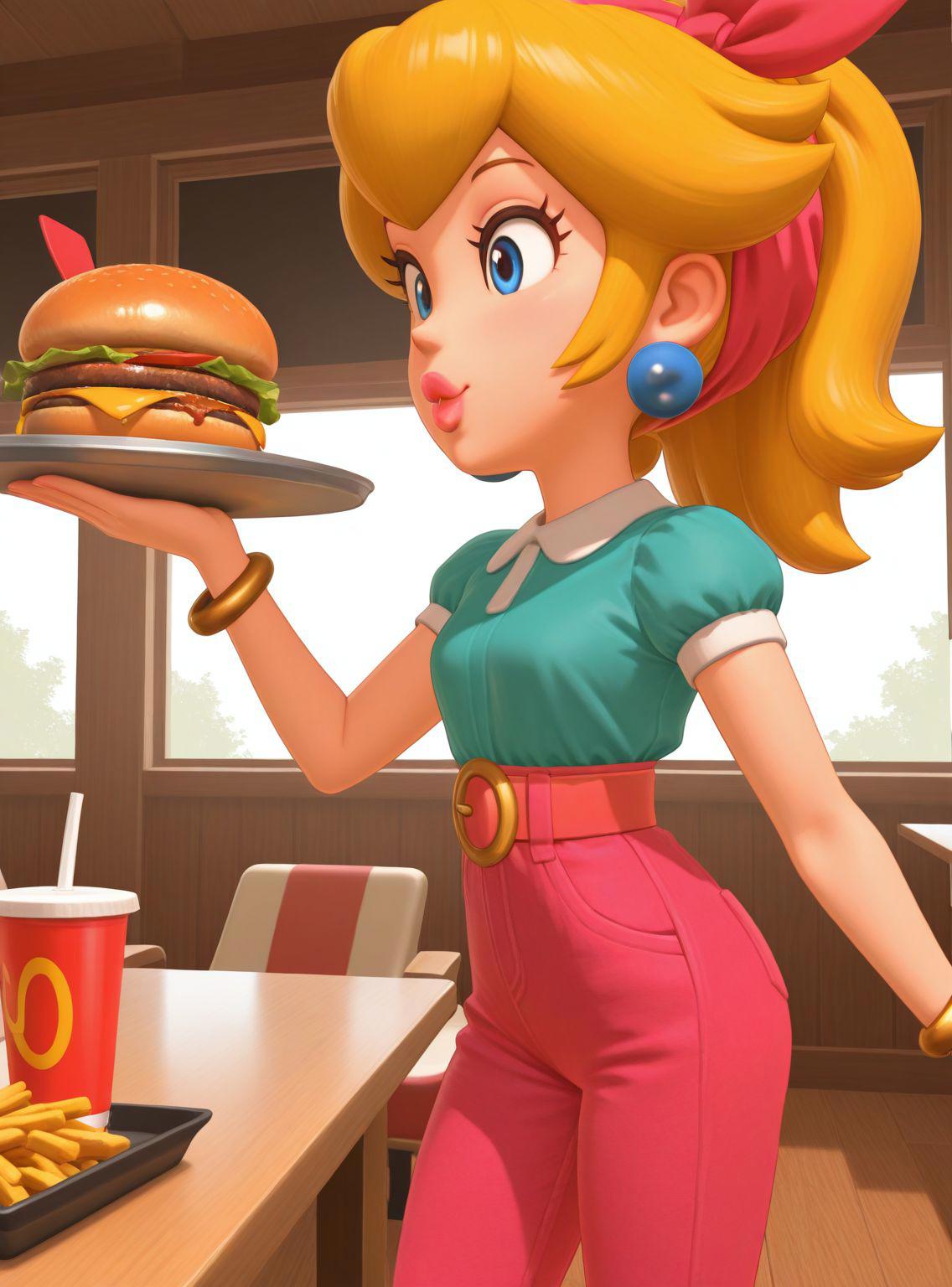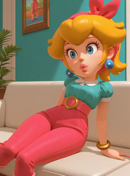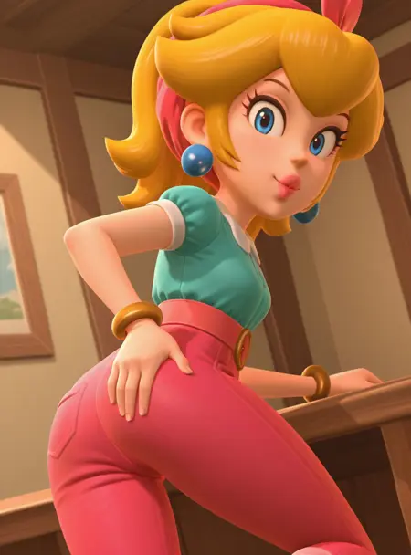 PeachSightseeingMKW, aqua shirt, pink pants, puffy short sleeves, blonde hair, single bracelet, blue eyes, pink hair bandana, blue earrings, pink lips, belt