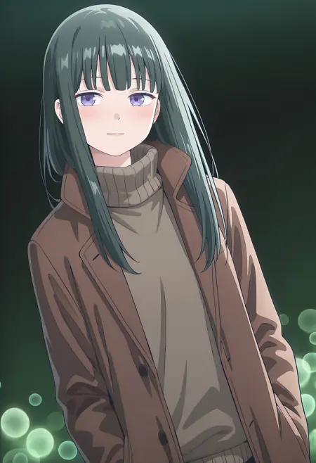 Lv999Yukari,紫色眼睛,深绿色长发,齐刘海,低双马尾,眼镜 — 移除“低双马尾,眼镜”,并用“长发垂下”替换以获得另一种发型