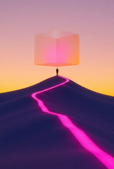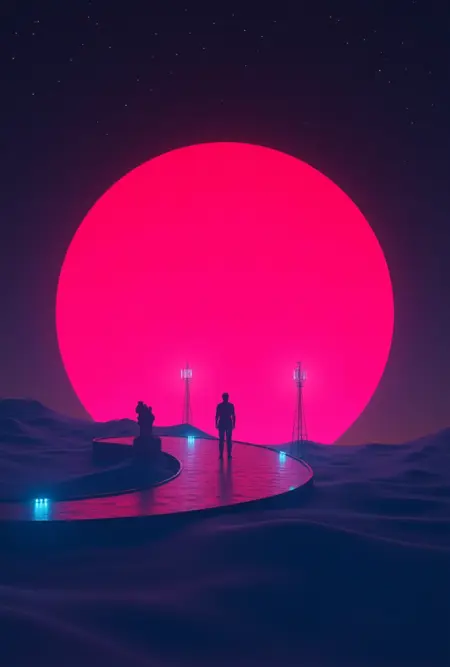 Solumirで生成されるビジュアルは、温かいネオンの輝きとソフトなグラデーション、人工的なコントラストをバランスよく組み合わせ、暗いシルエットを明るく形状に基づいたバックドロップに浮かび上がらせます。CGIを彷彿とさせる細部と超広角の構図が、奥行きと開放感を強調します。人物が登場することもありますが、極めて簡素で象徴的——デジタルの荘厳さに圧倒され、スケール、静寂、孤独を際立たせています。