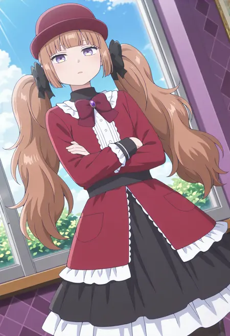 #2: red bowler hat, red bowtie, brooch, red dress, layered dress, frills, long sleeves, black pleated skirt, white trim, black pantyhose, red mary janes