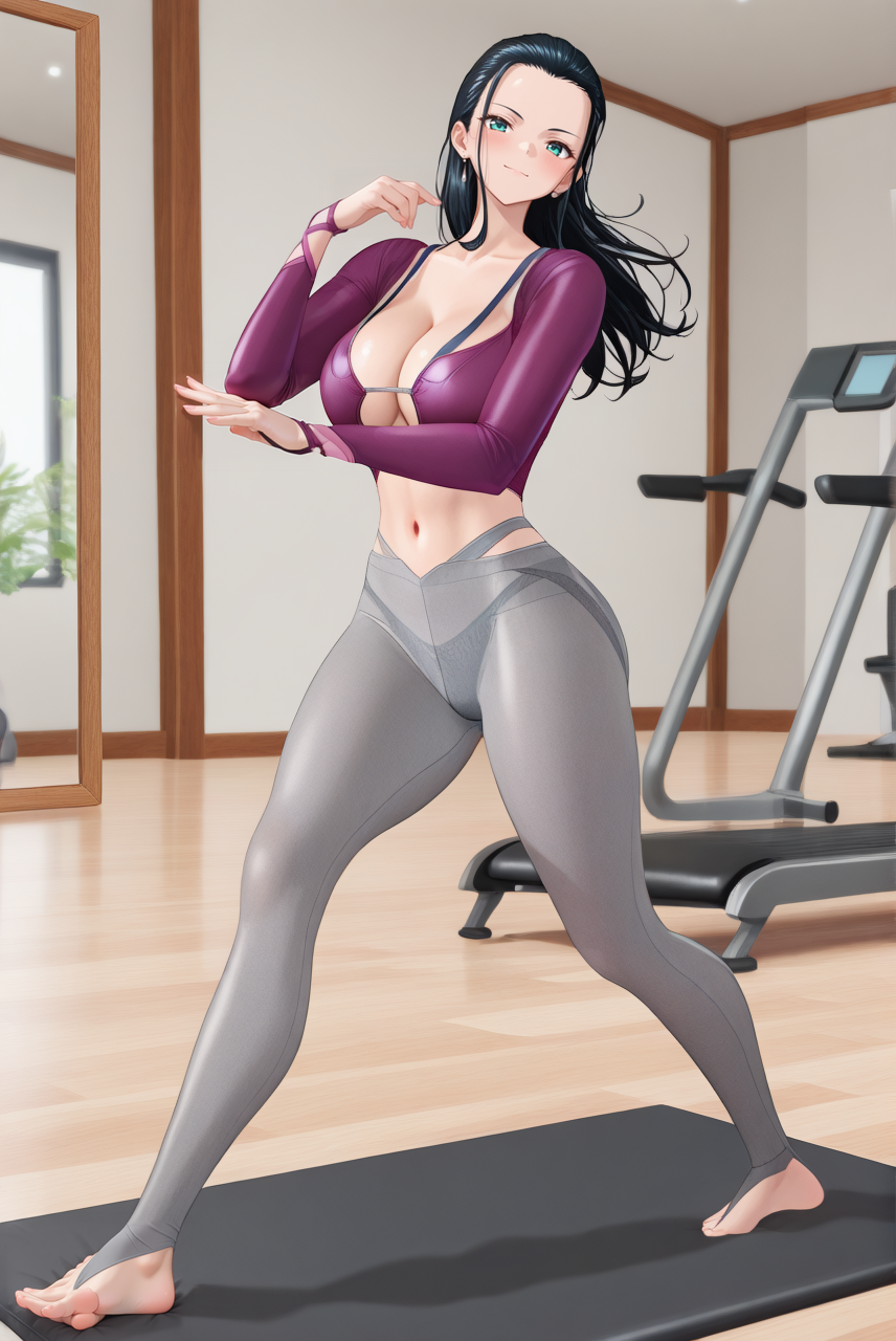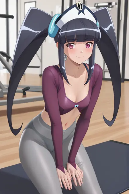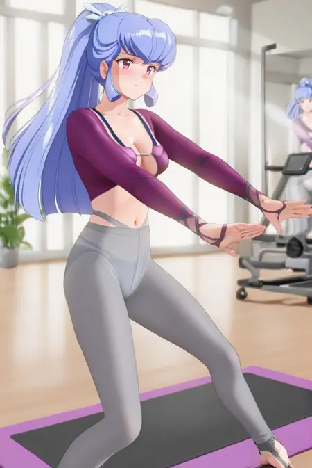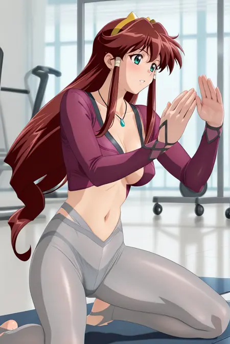 Main Prompt: MeditationTime, toeless legwear, stirrup legwear, grey pantyhose, panties, thong, navel, cleavage, purple shirt, long sleeves, skin tight