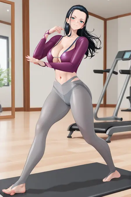 MeditationTime, toeless legwear, stirrup legwear, grey pantyhose, panties, thong, navel, cleavage, purple shirt, long sleeves, skin tight