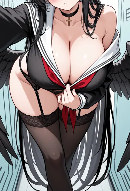 Avoid using prompts that indicate or imply eyes for the best results (i.e.: red eyes, looking back, looking at viewer, hair intakes, etc.)