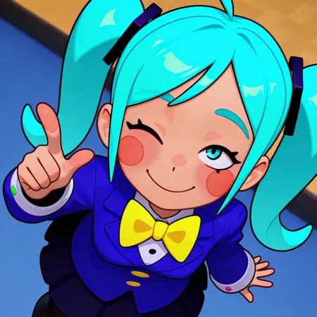 特征:腮红贴纸、双马尾、水蓝色头发、水蓝色眼睛,