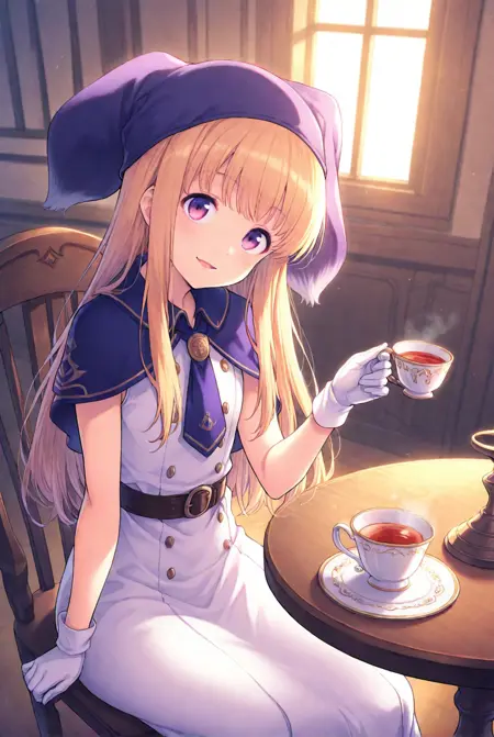 - ハット(耳付き)、青/ピンクのボウタイ、リボン、タートルネック、白いドレス、クロスレース服、ノースリーブ、肘グローブ、レイヤードスカート、ハイロースカート、青いスカート、白いシンクレア;