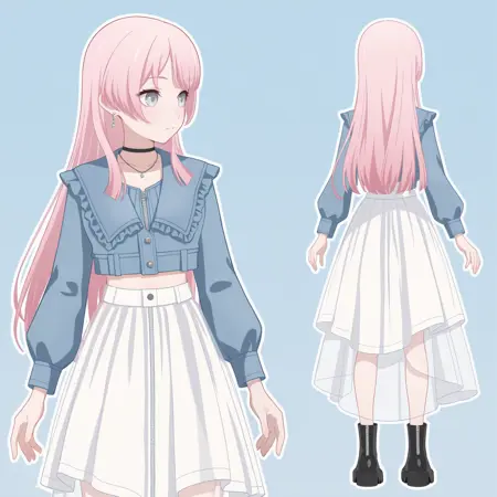 可选服装 衣服3:disantao,black choker,black high-top boots,blue jacket,zipper,blue shirt,buttons,denim cropped jacket,earrings,frills,long sleeves,necklace,see-through skirt,white long skirt