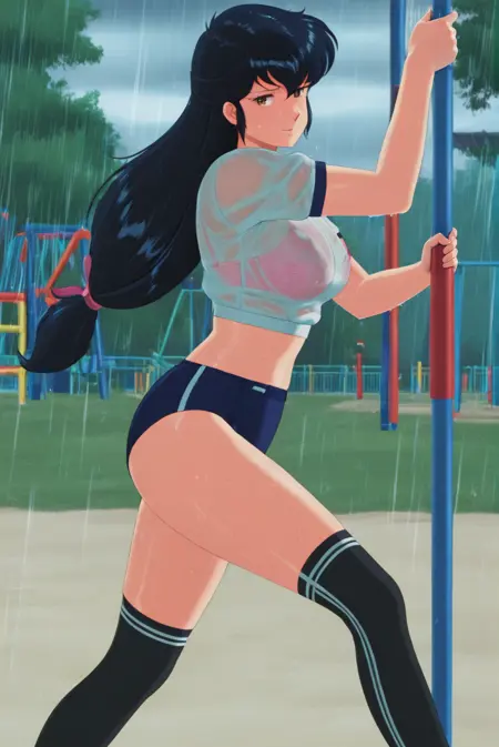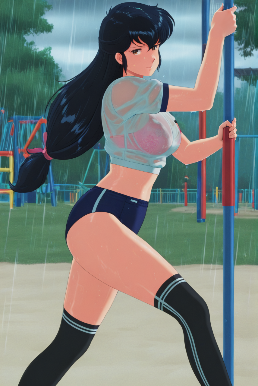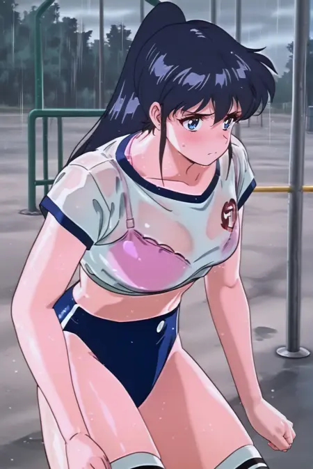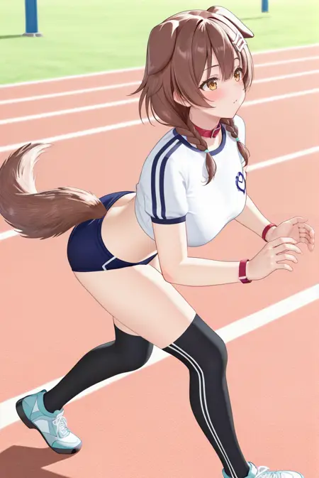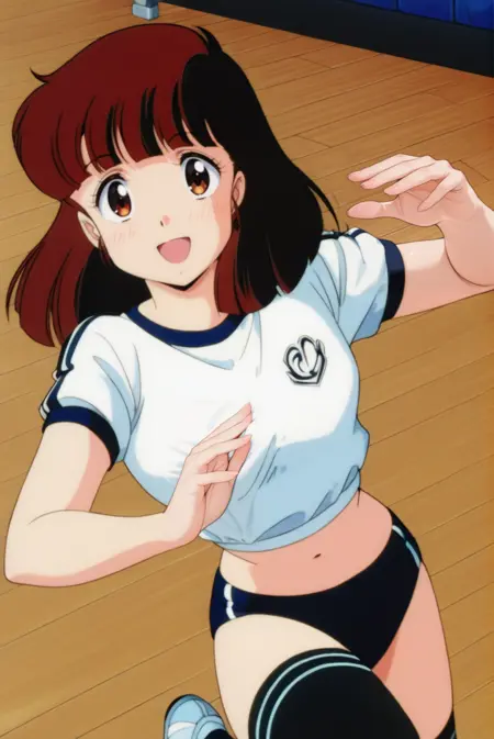 主提示词: StylishBloomers,健身服,露腹,黑色过膝袜,运动鞋,蓝色Buruma,上衣,短袖上衣,短袖,超膝袜,双竖条纹