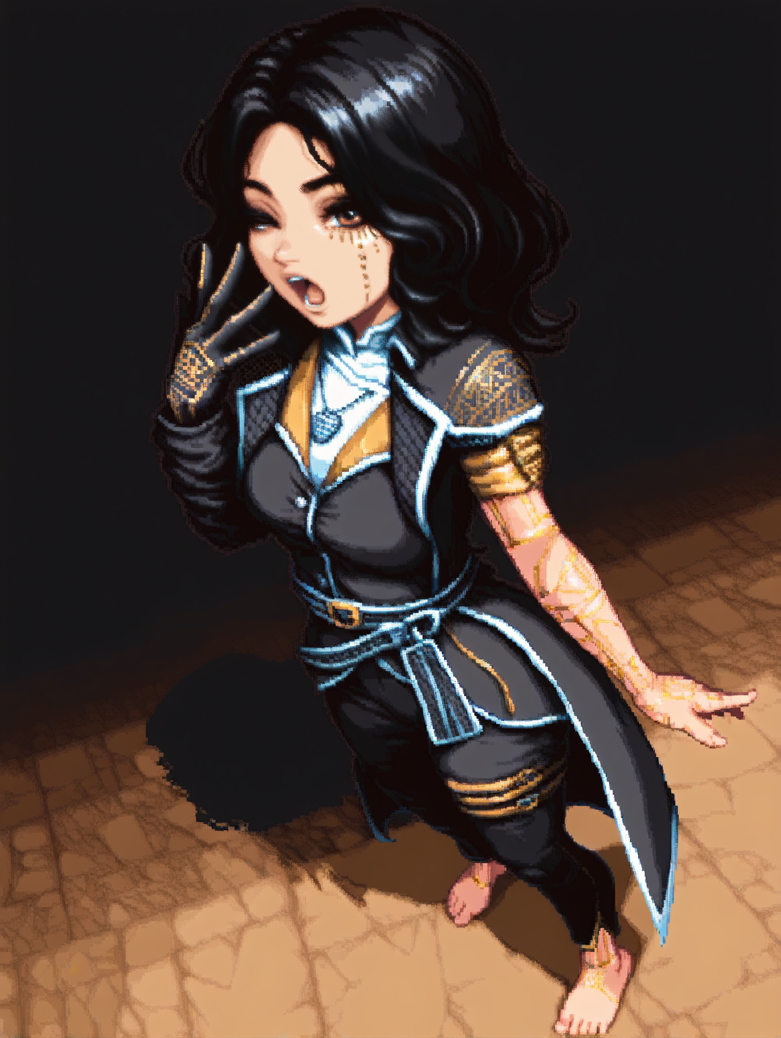 옷차림: 재킷, 바지, 장신구, 한 손장갑, 목걸이, 벨트, 숄더백, 맨발,
