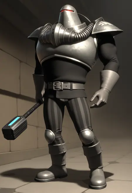 chestplate, grey pauldrons, black undersuit, grey gloves, striped pants, belt