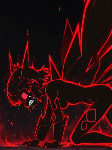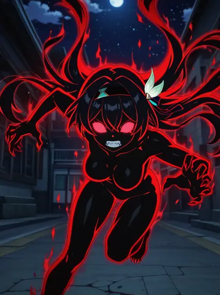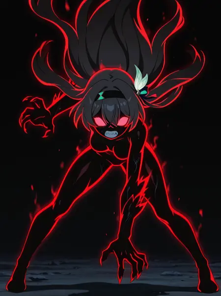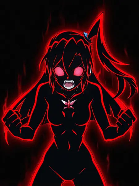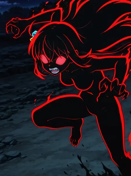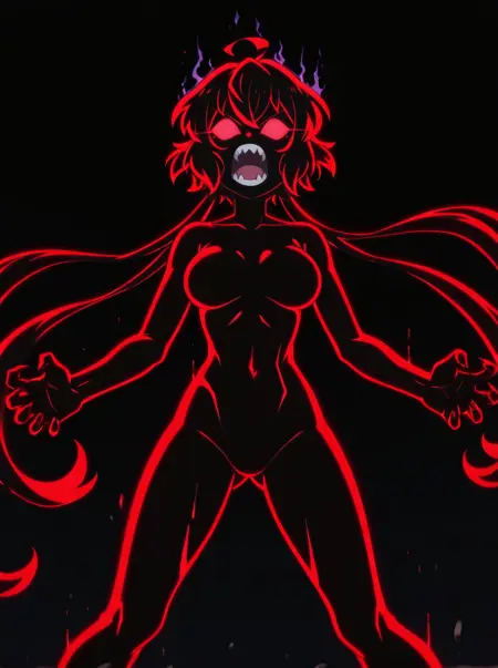 Prompts:glowing eyes, red eyes, , solo, glowing, sharp teeth, fangs, naked completely nude, black_hair red_aura , claws,