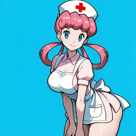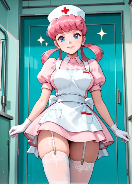 joyxd, 1girl, hat, nurse cap, blue eyes, solo, short sleeves, pink hair, collared dress, nurse, apron, hair rings, eyelashes, pink dress, bangs, white apron, twintails