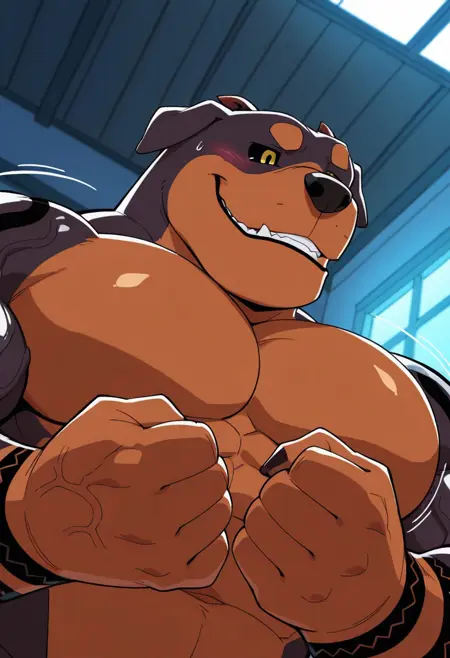 Reinforcement Prompts: "rottweiler, furry, horns, tattoo, black sclera, yellow eyes, muscular, manly, large pectorals"