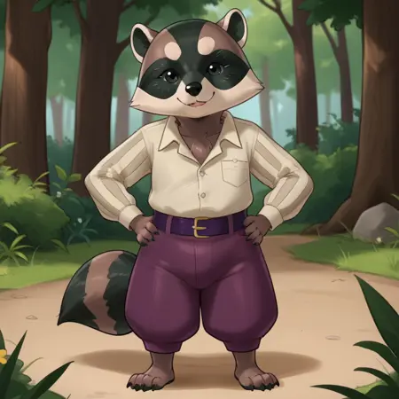 raccoon, raccoon boy, brown and black fur, black eyes, black nose, raccoon ears, raccoon tail,