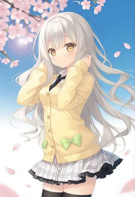 official alternate outfit,black thighhighs,pleated skirt,plaid skirt,long sleeves,yellow cardigan,white skirt,frilled skirt,black frills,miniskirt,buttons,green bow,waist bow,sleeve cuffs,white shirt,collared shirt,black necktie,wingtip collar,sleeve bow,