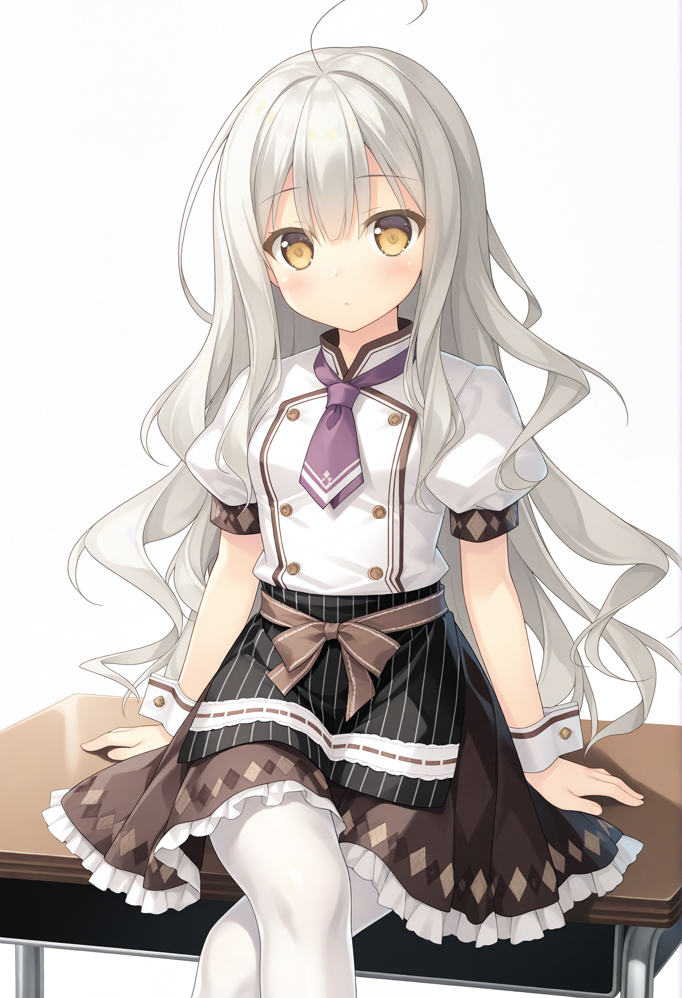 waitress,white pantyhose,puffy short sleeves,frilled skirt,white shirt,purple necktie,brown skirt,white frills,diamond print,print skirt,waist apron,vertical-striped apron,frilled apron,black apron,waist ribbon,brown ribbon,brown sleeve cuffs,white wrist cuffs,buttons,brown trim,collared shirt,