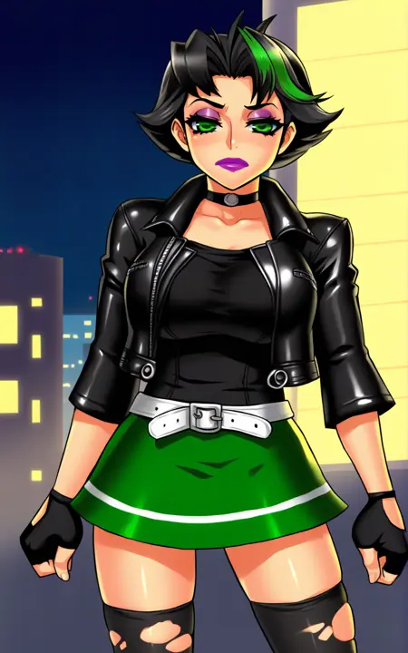 她的服装:黑色鞋履、运动鞋、黑色过膝袜、过膝袜、破损过膝袜、短裙、绿色短裙、上衣、黑色上衣、黑色夹克、皮夹克、敞开式夹克、手套、黑色手套、露指、黑色项圈**