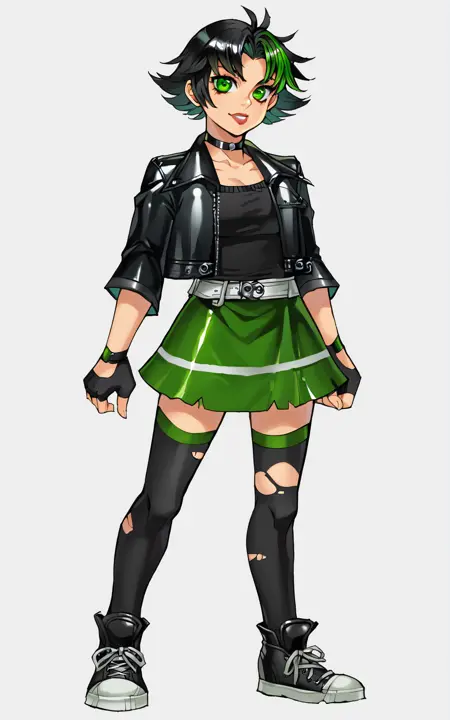 她的服装:黑色鞋履、运动鞋、黑色过膝袜、过膝袜、破损过膝袜、短裙、绿色短裙、上衣、黑色上衣、黑色夹克、皮夹克、敞开式夹克、手套、黑色手套、露指、黑色项圈**