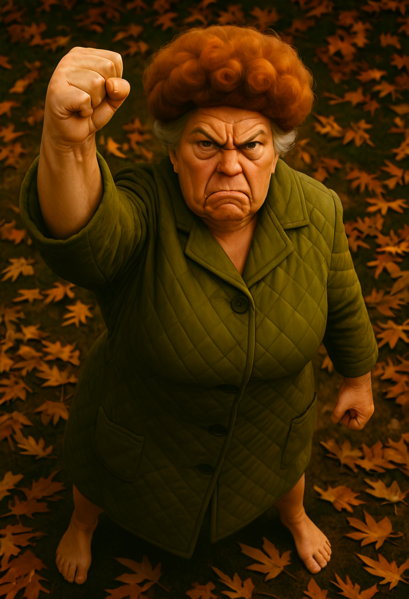This character is (coincidentally) jun3 "June Woolworth", portly, elderly, a brick wall of a woman. Most of the time frightening to behold. Her husband died in Korea. Or so he said. June never dressed up for much, other than to feed George. She'd grab her medicines (curiously the color and aroma of single malt) put on a pair of slippers or her black shoes, and wear a housecoat. She wore a wig like it was a hat. Usually crooked. (Couldn't quite nail the angle in the lora). George was the name of every single squirrel in the neighborhood. Use any combination of jun3, portly, elderly, curly brown wig, wig askew, green quilted coat to strengthen or avoid to weaken the character.