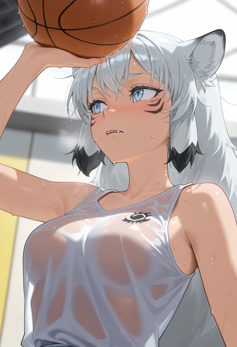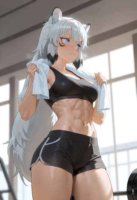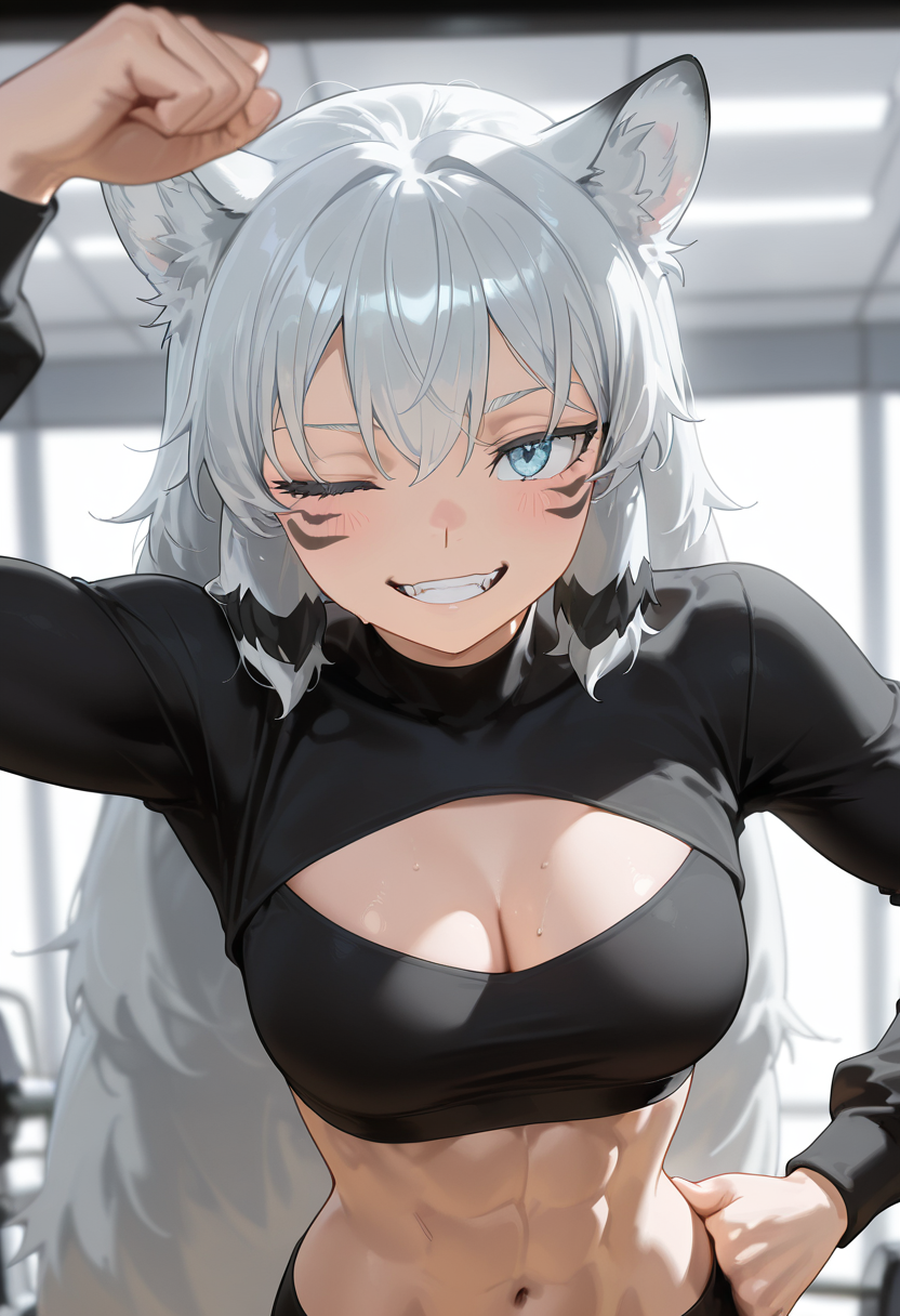 彼女の外見タグ: 1girl, 中程度の胸, 青い目, 黒髪, 非常に長い髪, 白髪, 灰色の髪, 多色髪, 二色髪, 動物の耳のふわふわ, 尖った歯, 顔の模様, 狼の耳, タイガーちゃん,